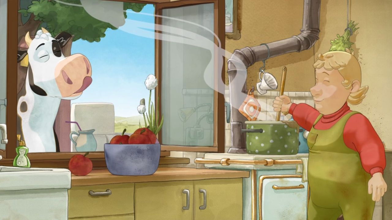 Ein köstlicher Duft lockt Lieselotte. Die Bäuerin kocht Apfelmus. Leider eine Bestellung des Ladenbesitzers. Lieselotte soll einen gesunden Kräutersaft trinken. Doch der schmeckt ihr nicht. Deshalb schüttet sie die grüne Soße in eine leere Kanne. Als der Ladenbesitzer seine Kannen Apfelmus abholt, schnappt er sich auch Lieselottes Gefäß. Schnell müssen sie die Kanne wieder heraus nehmen, bevor etwas auffällt.