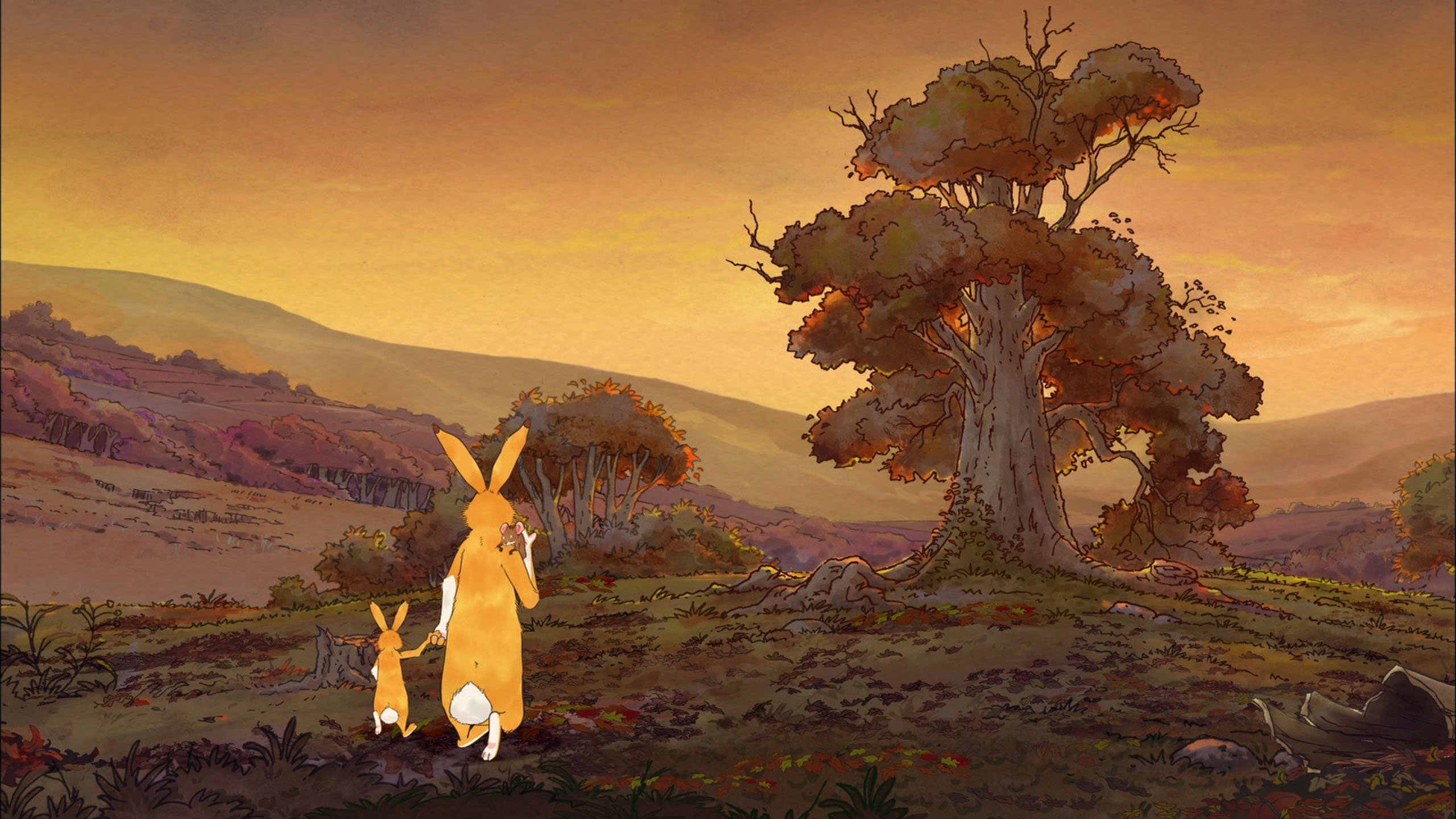 Es ist Herbst. Der kleine Hase und der große Hase wollen den schönen Tag nutzen und mit ihrer Freundin, der kleinen Feldmaus, einen Ausflug zur Wiese oben auf dem großen Hügel machen. Dort wachsen nämlich köstliche Brombeeren, die nun reif sein müssten. Und tatsächlich, der weite Weg lohnt sich. Die Büsche hängen voll mit reifen Früchten. Nach einem ausgiebigen Mahl ruhen sie sich erstmal eine Weile aus.